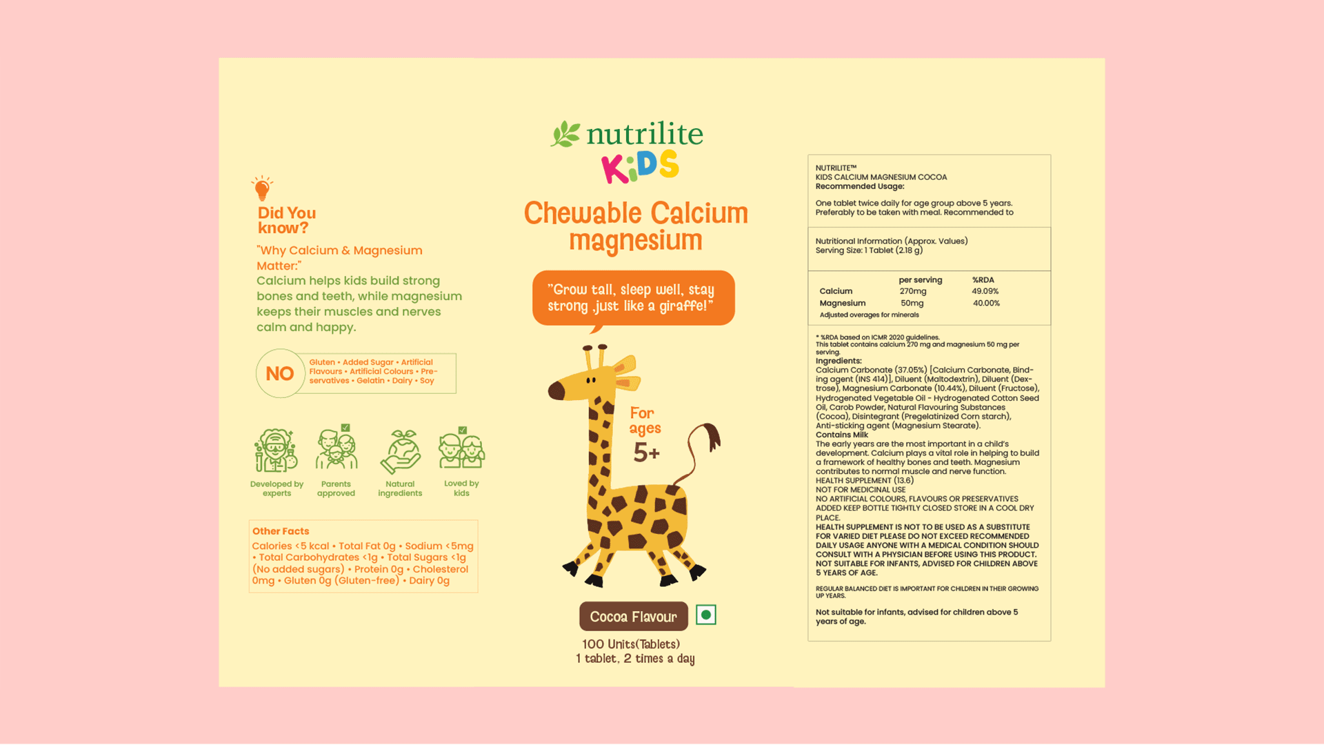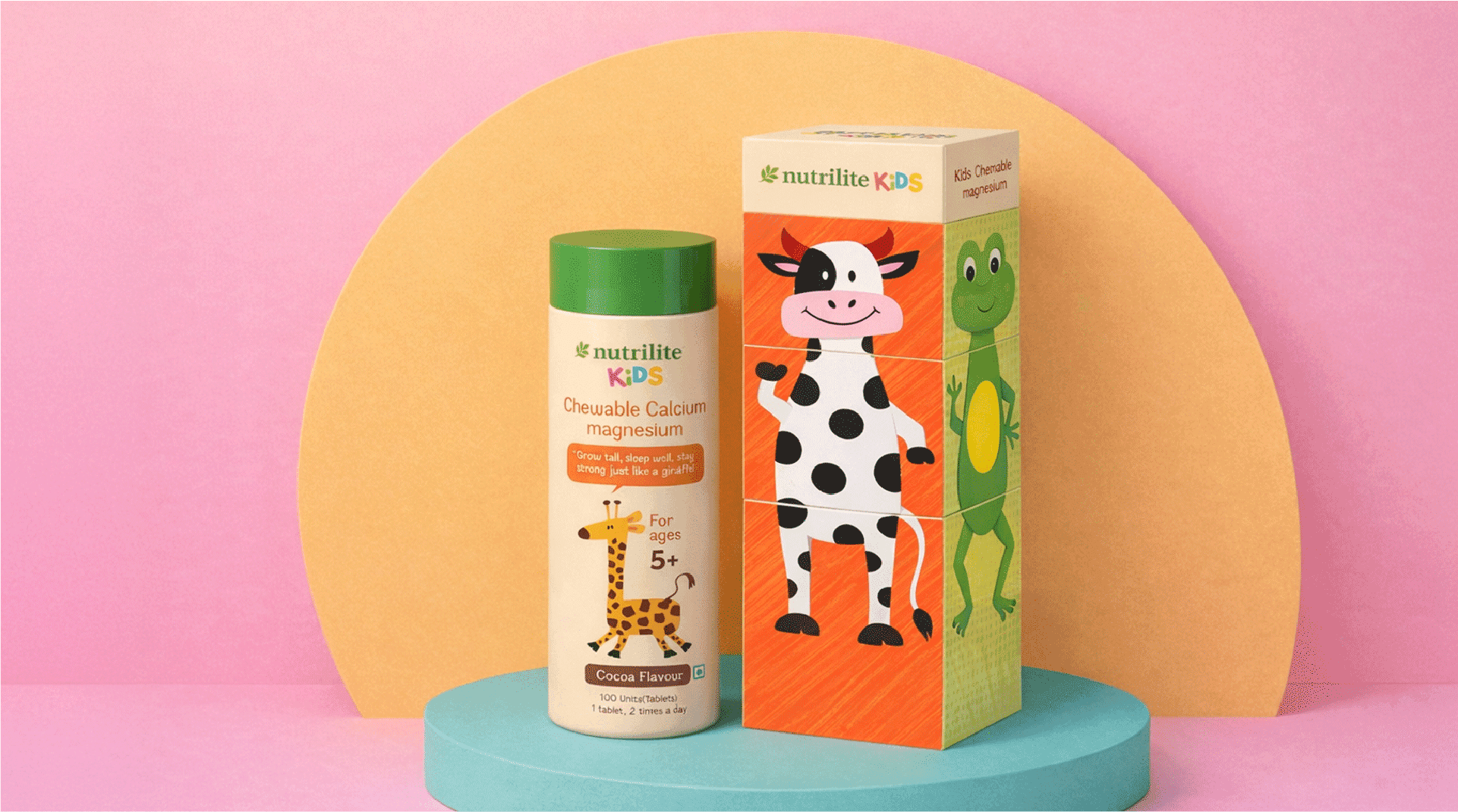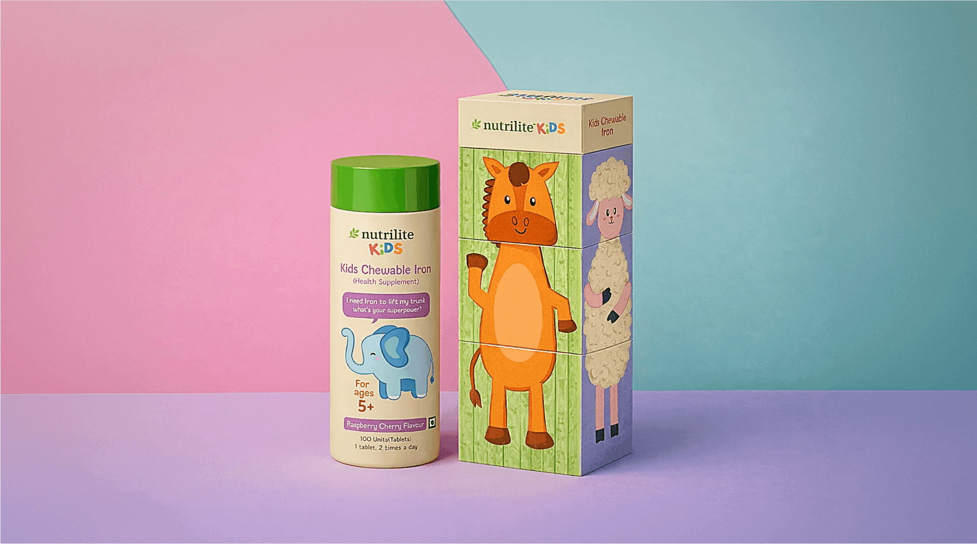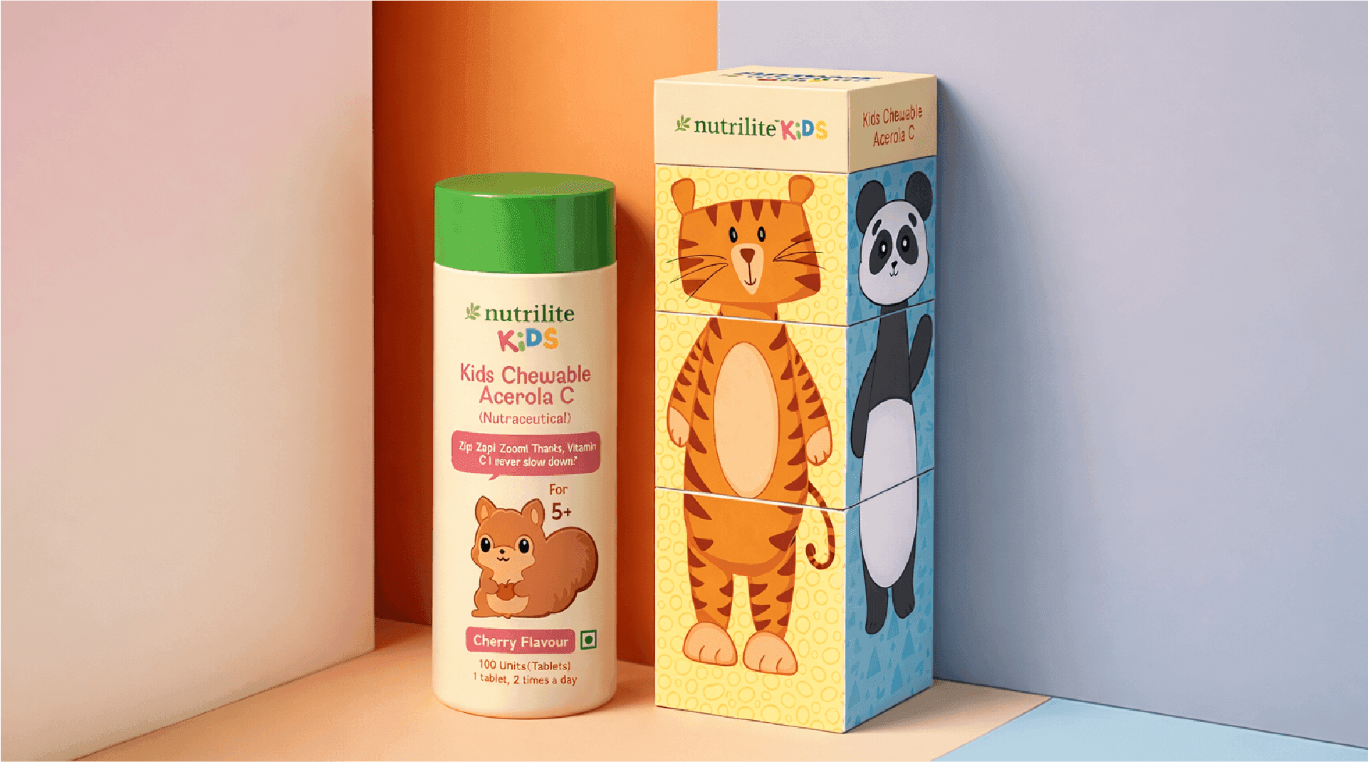 The existing packaging for Nutrilite Kids Chewables by Amway uses a clean white bottle with colorful labels and friendly animal illustrations . However, it remains non interactive and largely functional, offering limited engagement or playful experience for kids.