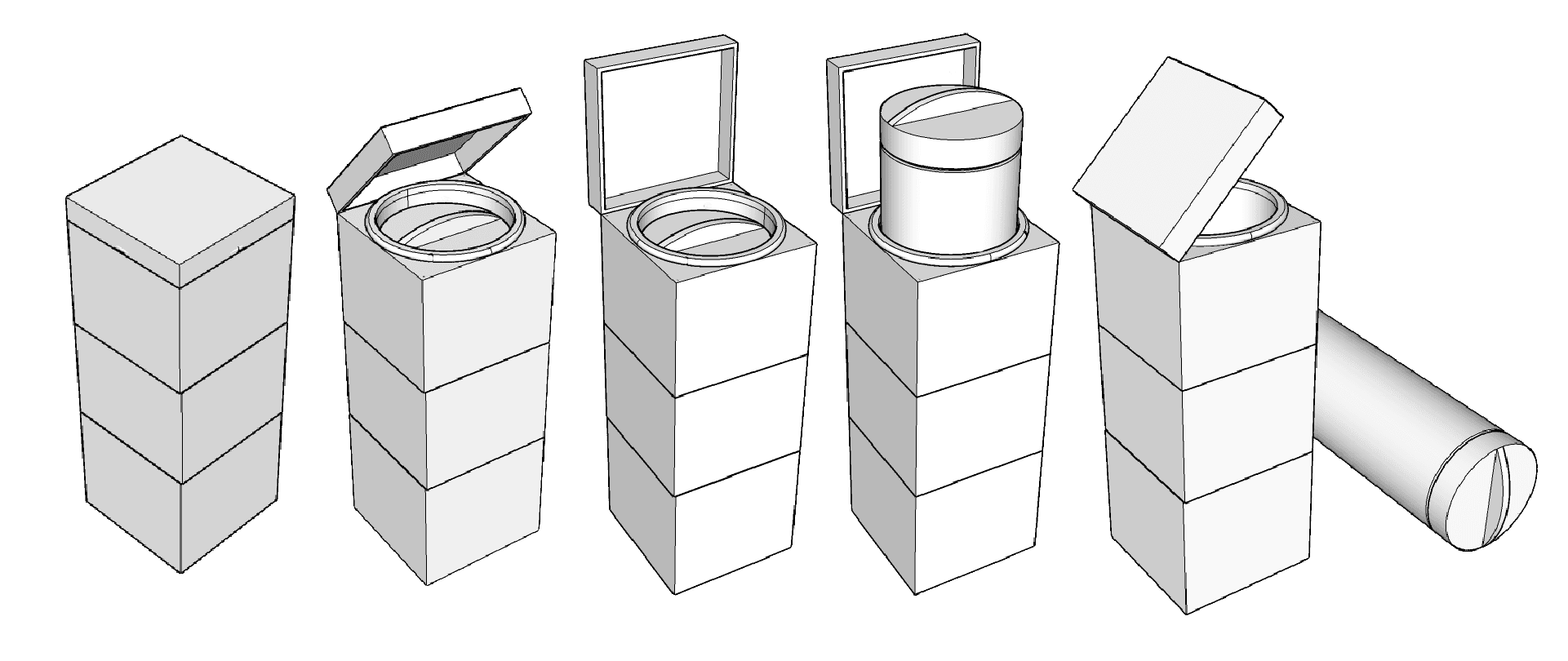 Key line drawings were developed to define the structural form and proportions of the packaging. These drawings helped refine the stacked cube system around the cylindrical bottle.