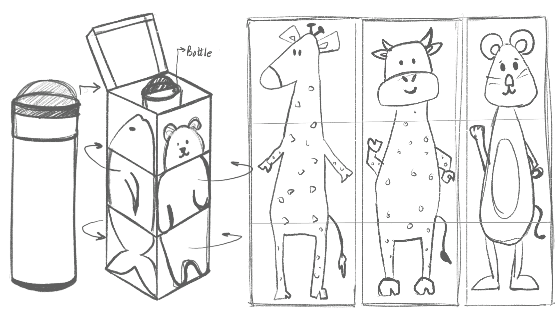 Through iterative ideation, the design evolves into a stacked cube system around a cylindrical bottle, combining play and packaging. The final concept allows animal illustrations to mix and match, creating an interactive and engaging experience for kids.