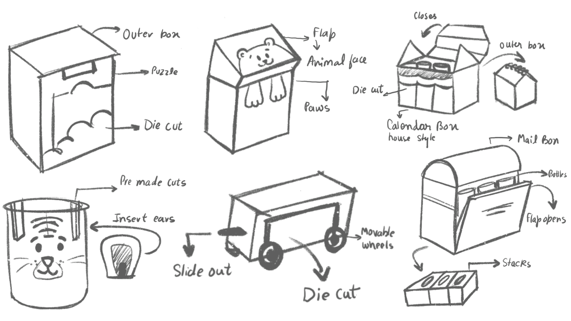 Exploring different interactive packaging structures through sketches, testing forms like puzzles, sliding mechanisms, and playful boxes.