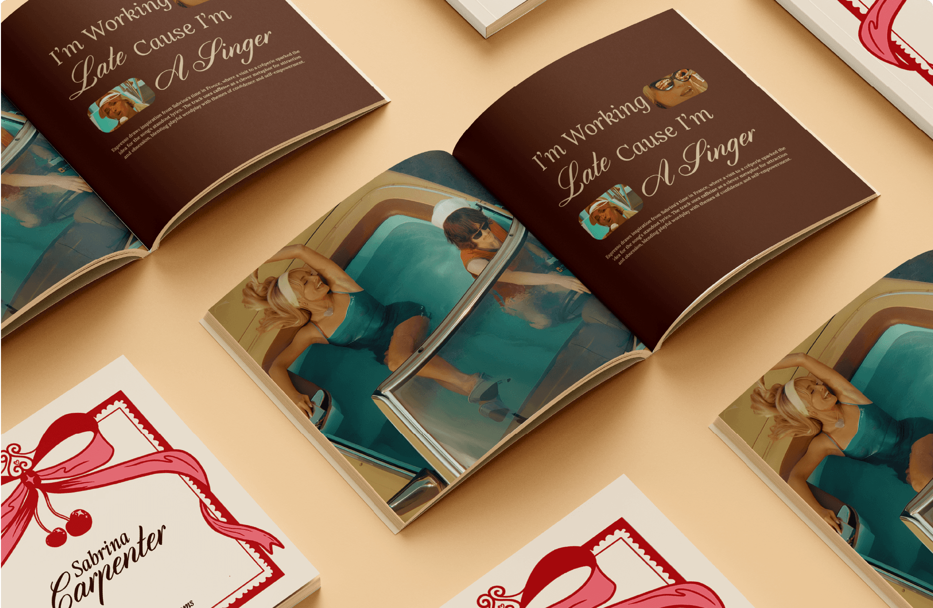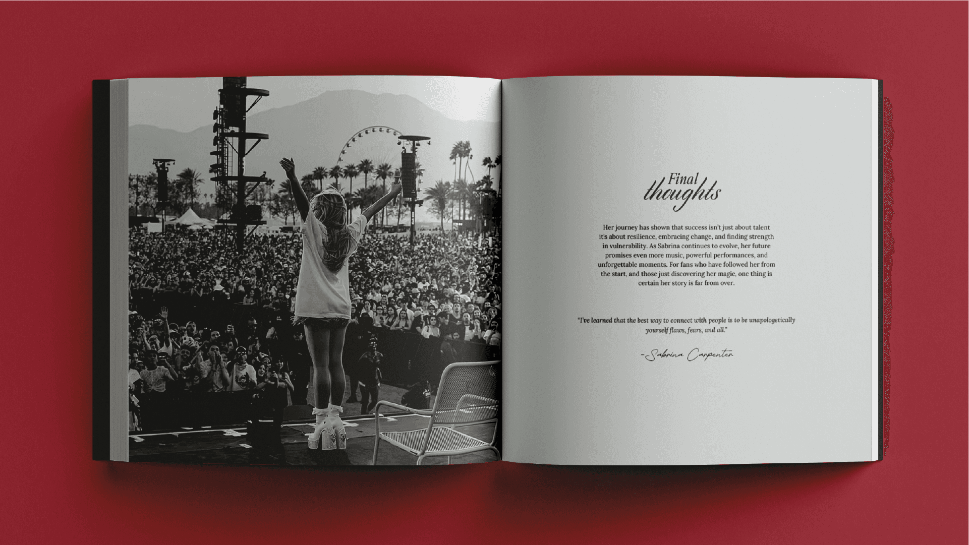 This coffee table book uses clean modular grids and Sabrina Carpenter’s bright, playful aesthetic to create a vibrant visual experience. Her signature colours, bold style, and energetic personality guide the entire layout. Each spread combines organised grids with expressive graphics to reflect her music journey and artistic growth in a fun, modern, and cohesive way.